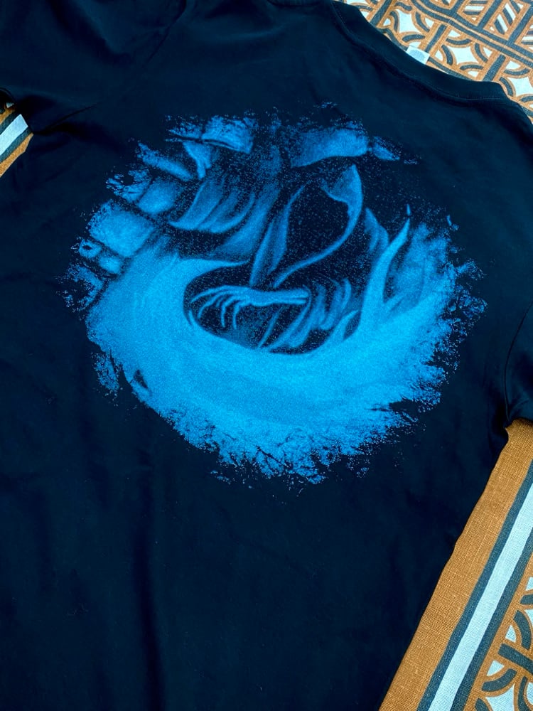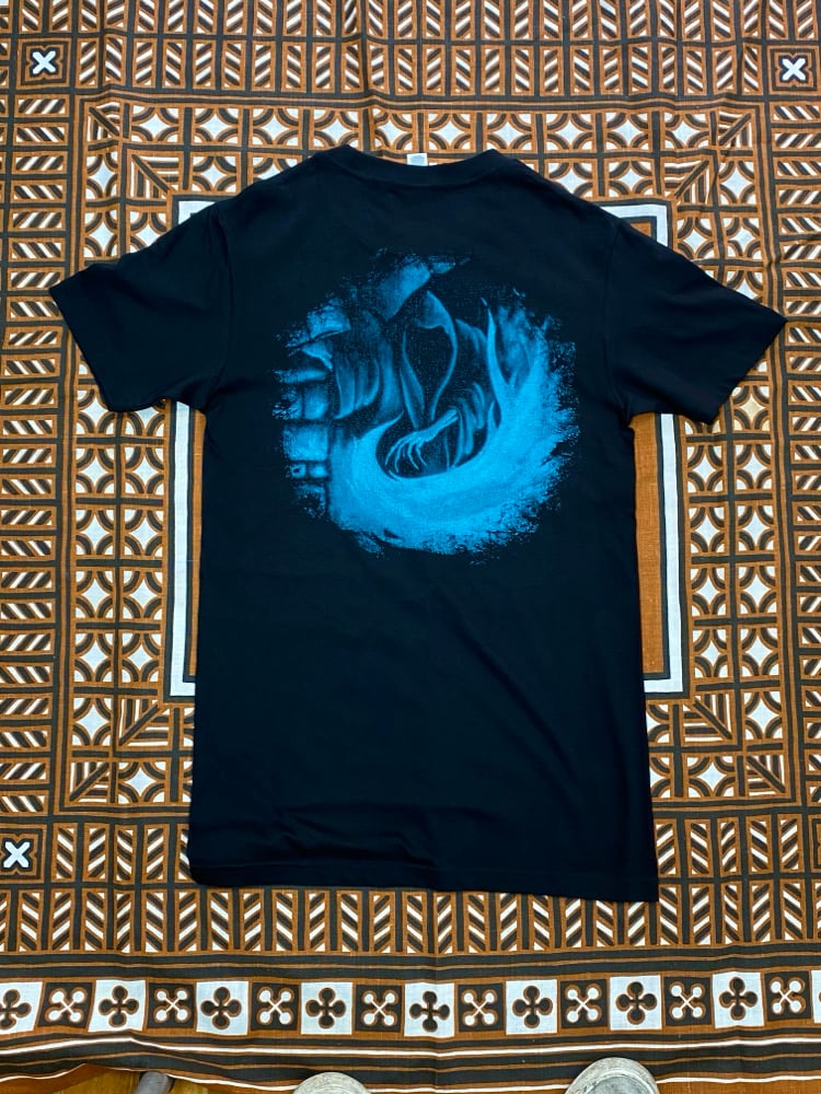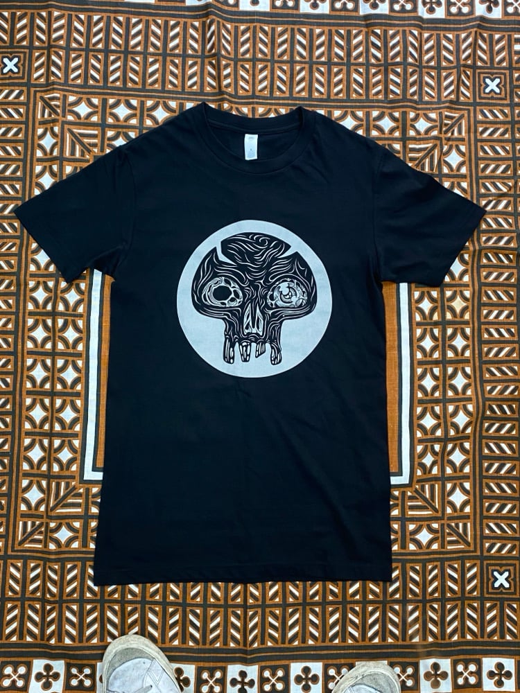 A screen printed Dark Ritual shirt. A black mana skull symbol on front, Dark Ritual artwork on back