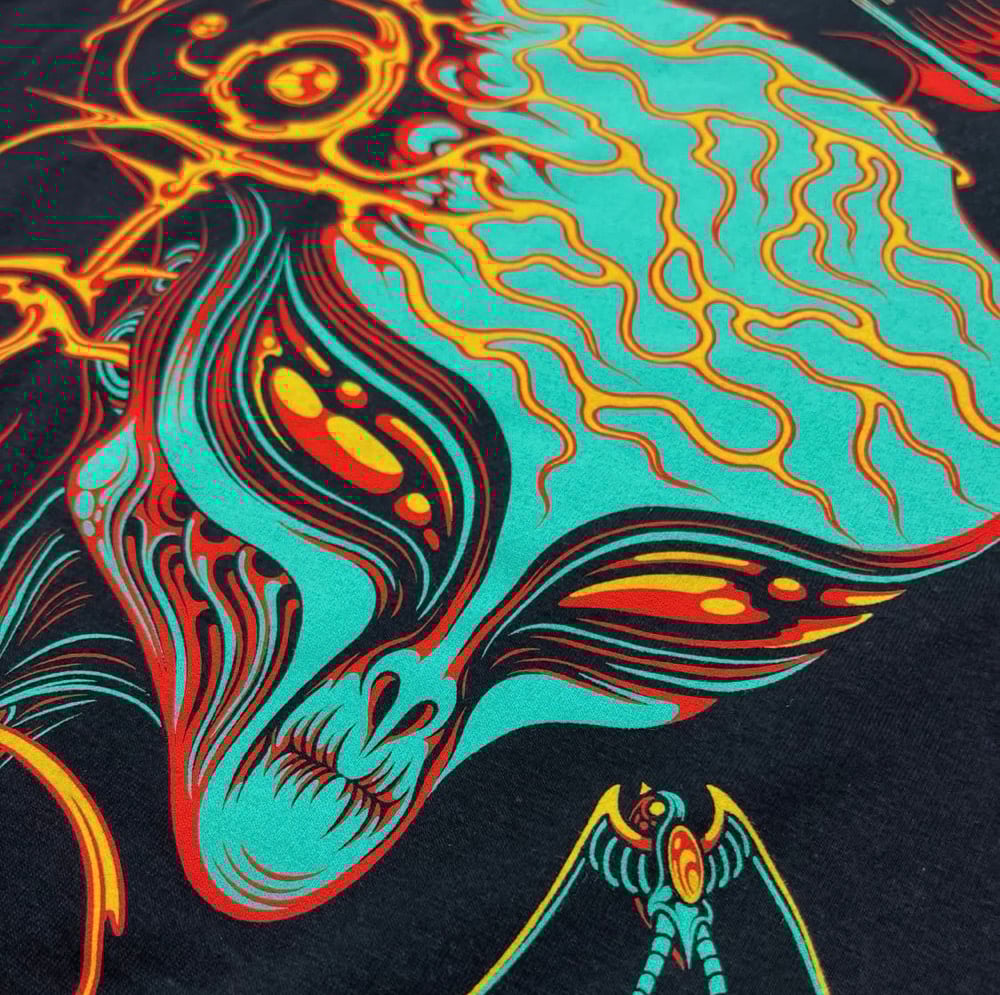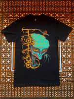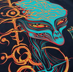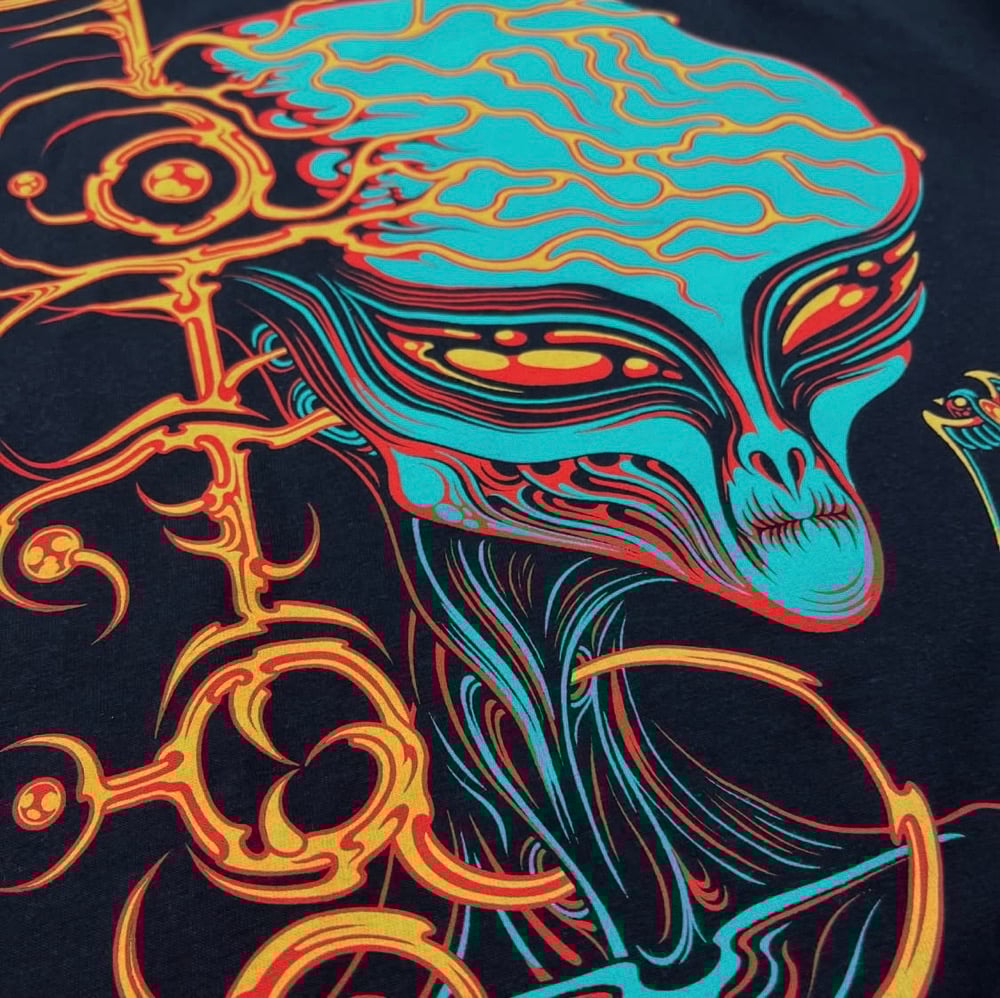 A screen printed Extraterrestrial Biological Entity shirt with neural implant TATTOO lettering